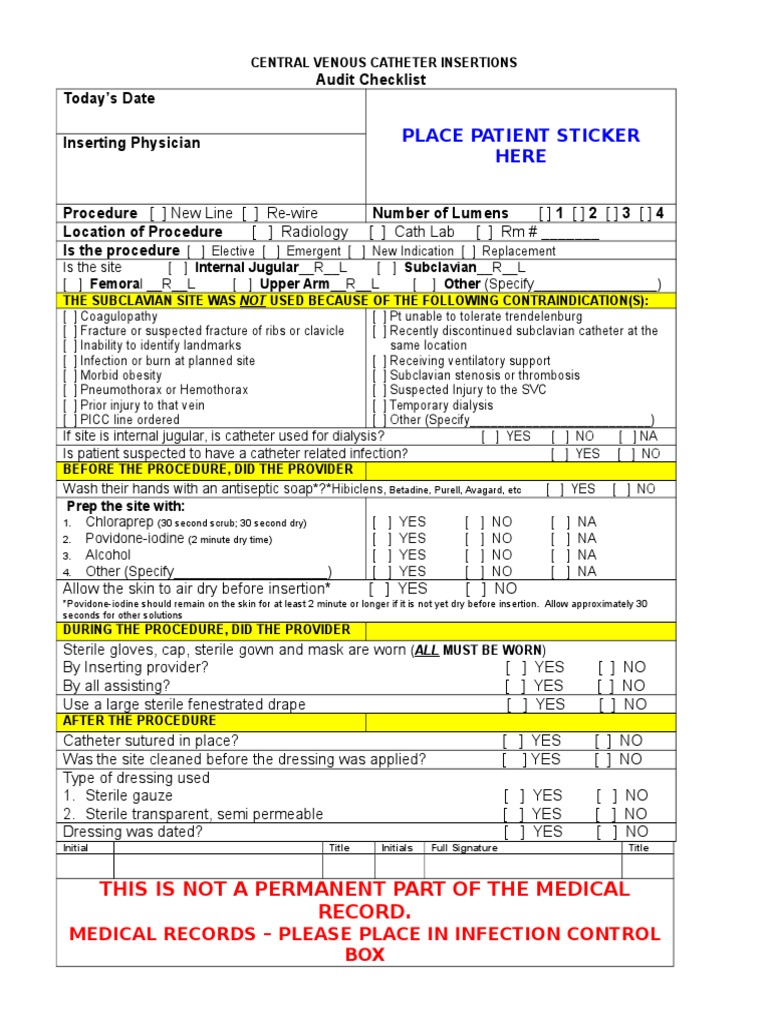 Place a sterile gauze dressing or a sterile transparent semipermeable dressing over the insertion site. Gather all necessary equipment. Central Line Maintenance Audit Form.